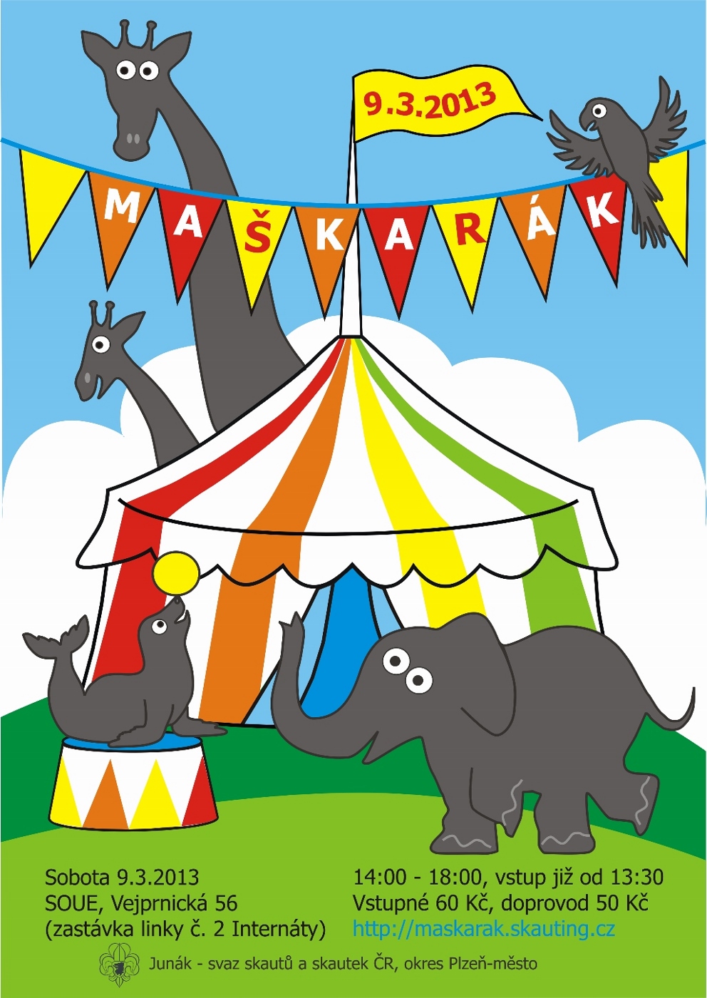 Popis akce: Maškarák je maškarní bál pro všechny kluky a holky od 4 do 14 let, ale zváni jsou samozřejmě úplně všichni. Stejně jako minulé ročníky ho pro Vás opět připravují plzeňští skauti. Letošní ročník se uskuteční v sobotu 9. března 2013 v sálu SOUE na Skvrňanech (zastávka Internáty) od 14:00 (vstup již od 13:30). Vstupné pro maškarníky je 60 Kč, pro jejich doprovod 50 Kč.